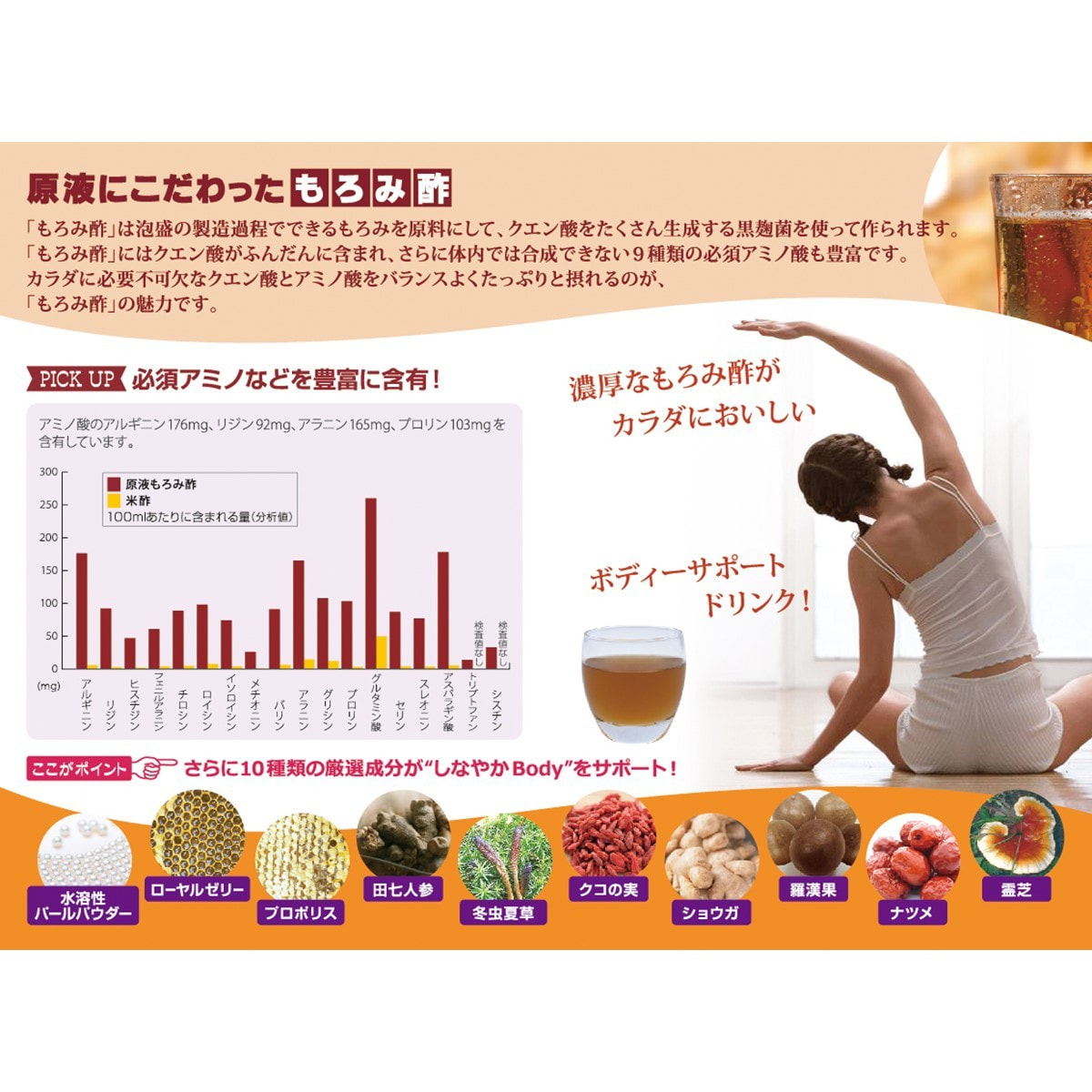 原液もろみ酢40,000mgを主成分とし、水溶性パールパウダー、ローヤルゼリー、プロポリス、田七人参、冬虫夏草、クコの実、ショウガ、羅漢果、ナツメ、霊芝の10種類の成分を配合した水を一滴も加えず製造した濃厚ボディサポートドリンクです。