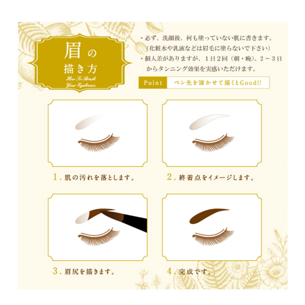 ①本品は、従来のアイブロウにセルフタンニング成分を配合した眉専用化粧料です。