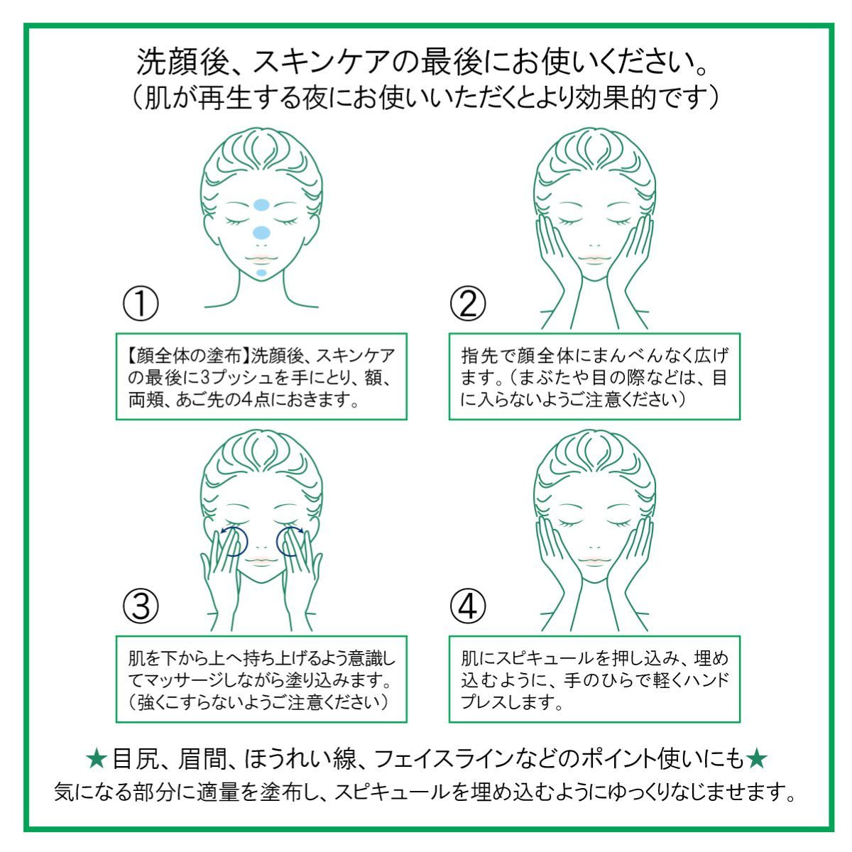 洗顔後、スキンケアの最後にお使いください(夜にお使いいただくとより効果的です)。