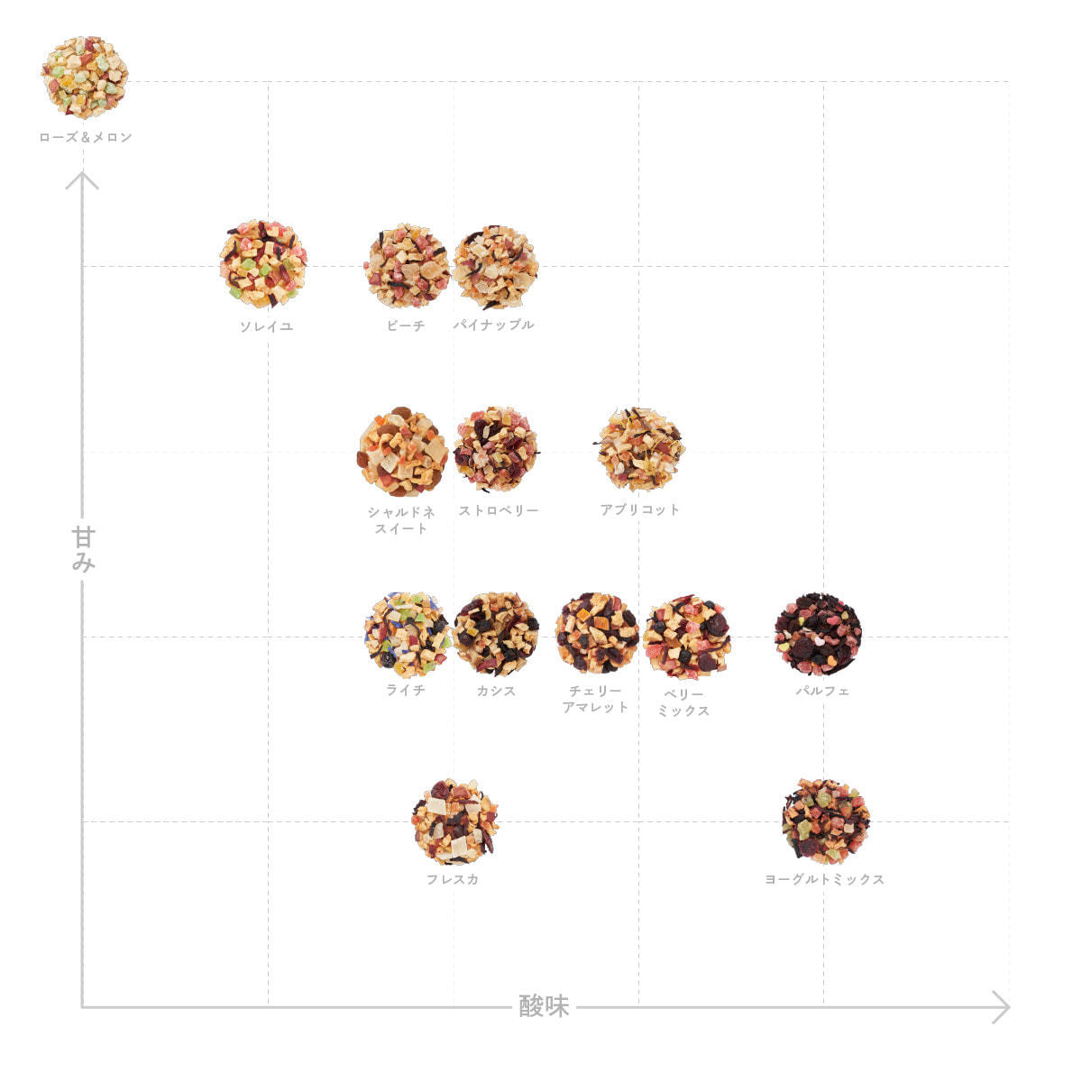 加糖ドライパイナップル(タイ製造)、加糖ドライパパイヤ、有機ドライアップル、有機ハイビスカス/香料、クエン酸、保存料(亜硫酸塩)