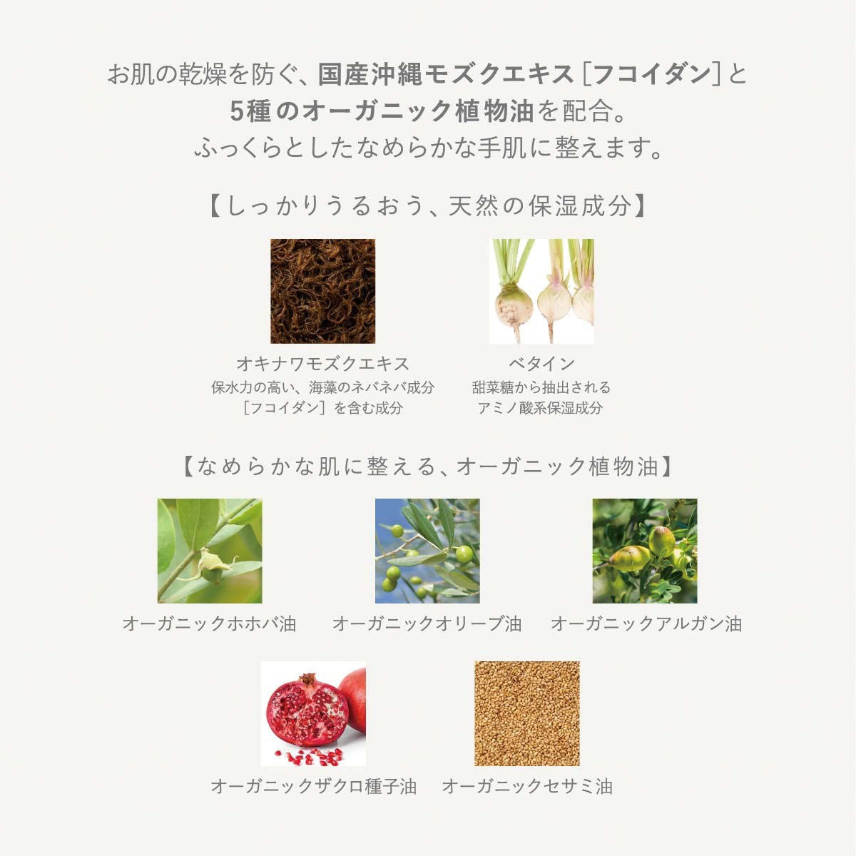水、プロパンジオール、ホホバ種子油*、オリーブ果実油*、スクワラン、ヒマワリ種子油、水添ナタネ油アルコール、ステアリン酸、ペンチレングリコール、ベヘニルアルコール、パルミチン酸セチル、ベタイン、カプロイルプロリンNa、アルガニアスピノサ核油*ザクロ種子油*ゴマ油*グリチルリチン酸2K、オキナワモズクエキス、ミツロウ、ステアリン酸スクロース、ジステアリン酸スクロース、ミリスチン酸ポリグリセリル-10、キサンタンガム、トコフェロール、ラベンダー花油、ウンシュウミカン果皮油、カナリヤノキ樹脂油、ニオイテンジクアオイ油、アトラスシーダ木油、ボスウェリアネグレクタ樹脂油、ビャクダン油、ウイキョウ果実油、ダマスクバラ花油