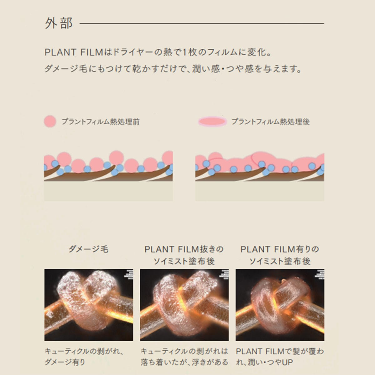 PLANT FILM(※1)は髪の内部・外部を同時にダメージ補修。