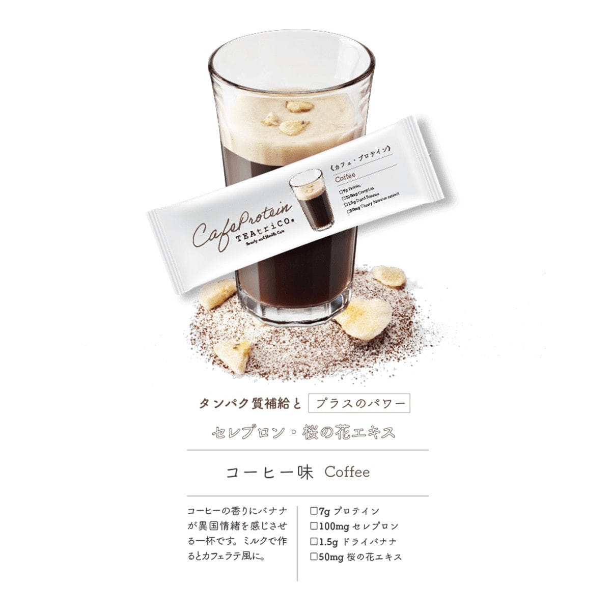 ホエイプロテインパウダー(ドイツ製造、国内製造)、粉末状大豆たん白、マルトデキストリン、乾燥バナナ、インスタントコーヒー(コーヒー豆(インドネシア))、酵母エキスパウダー、桜の花エキスパウダー/乳化剤、微粒二酸化ケイ素、甘味料(ステビア)、香料、(一部に乳成分・大豆・バナナを含む)