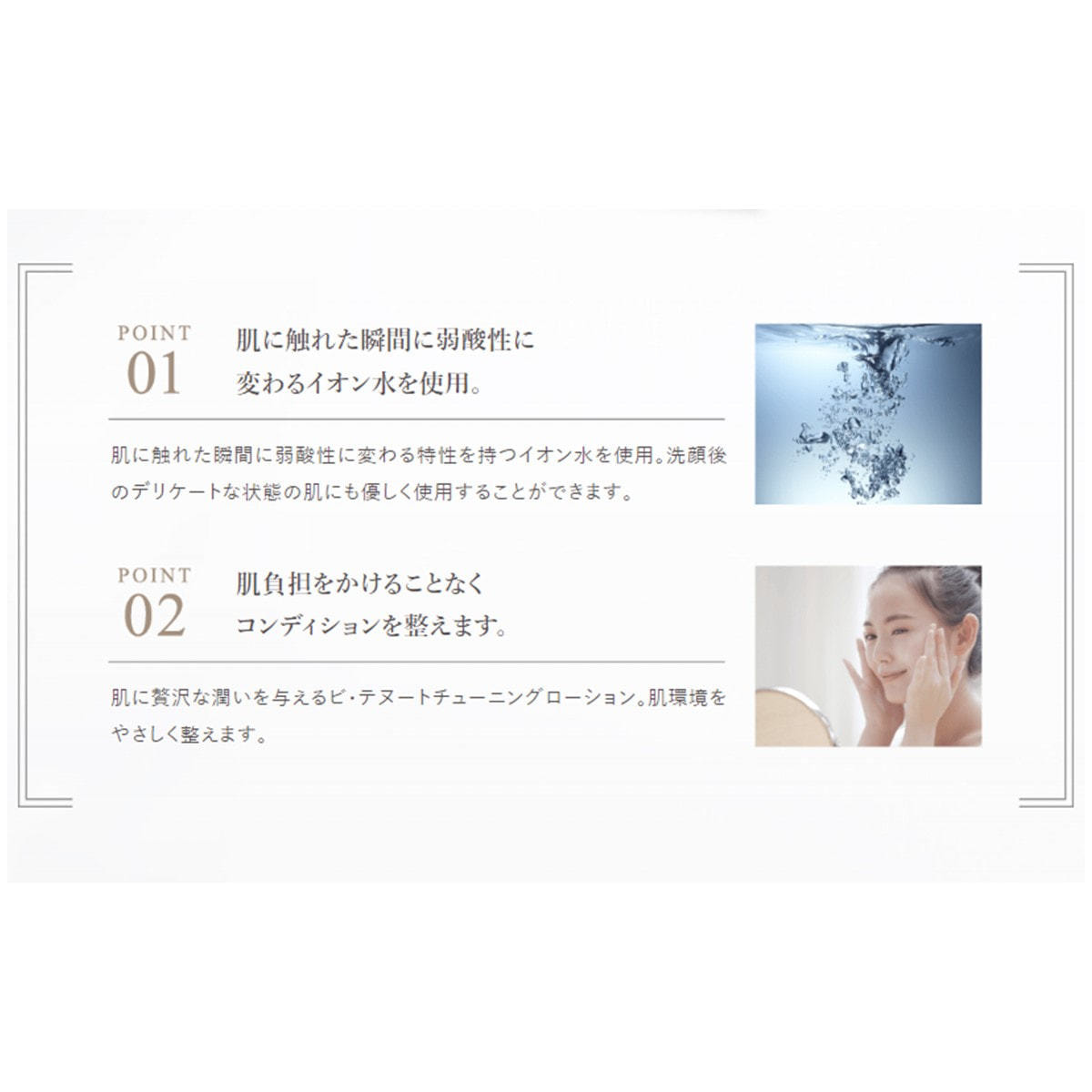 弱酸性のイオン水によって肌コンディションを整え、クリアな状態へと導きます。