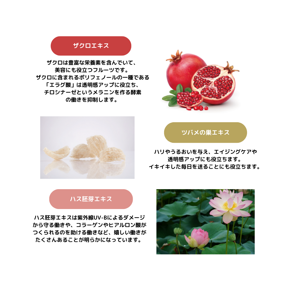 ザクロに含まれるポリフェノールの一種である「エラグ酸」は透明感アップに役立ち、チロシナーゼというメラニンを作る酵素の働きを抑制します。