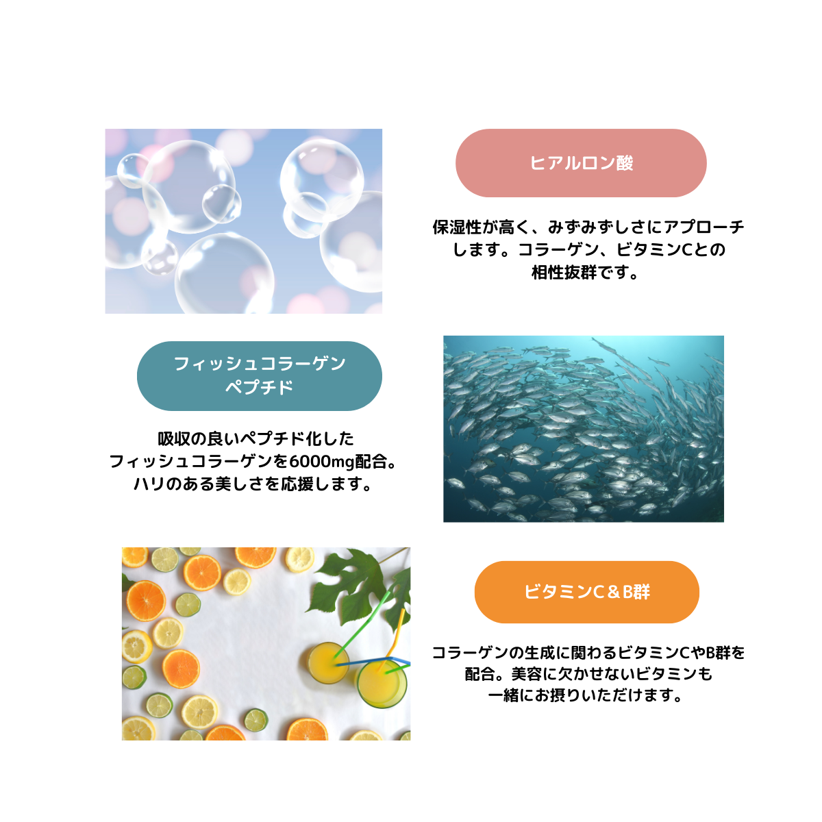 コラーゲンペプチド(ゼラチンを含む、国内製造)、ガラクトオリゴ糖液糖、オレンジ果汁、エリスリトール、ハス胚芽エキス末、L-オルニチン塩酸塩、γ-アミノ酢酸(ギャバ)、ザクロエキス末(エラグ酸含有)、ツバメの巣加工品/酸味料、環状オリゴ糖、安定剤(増粘多糖類)、ビタミンC、酵素処理ヘスペリジン、甘味料(ステビア)、香料、ヒアルロン酸、ナイアシン、パントテン酸カルシウム、 ビタミンB1、ビタミンB6、ビタミンB2、ビタミンB12