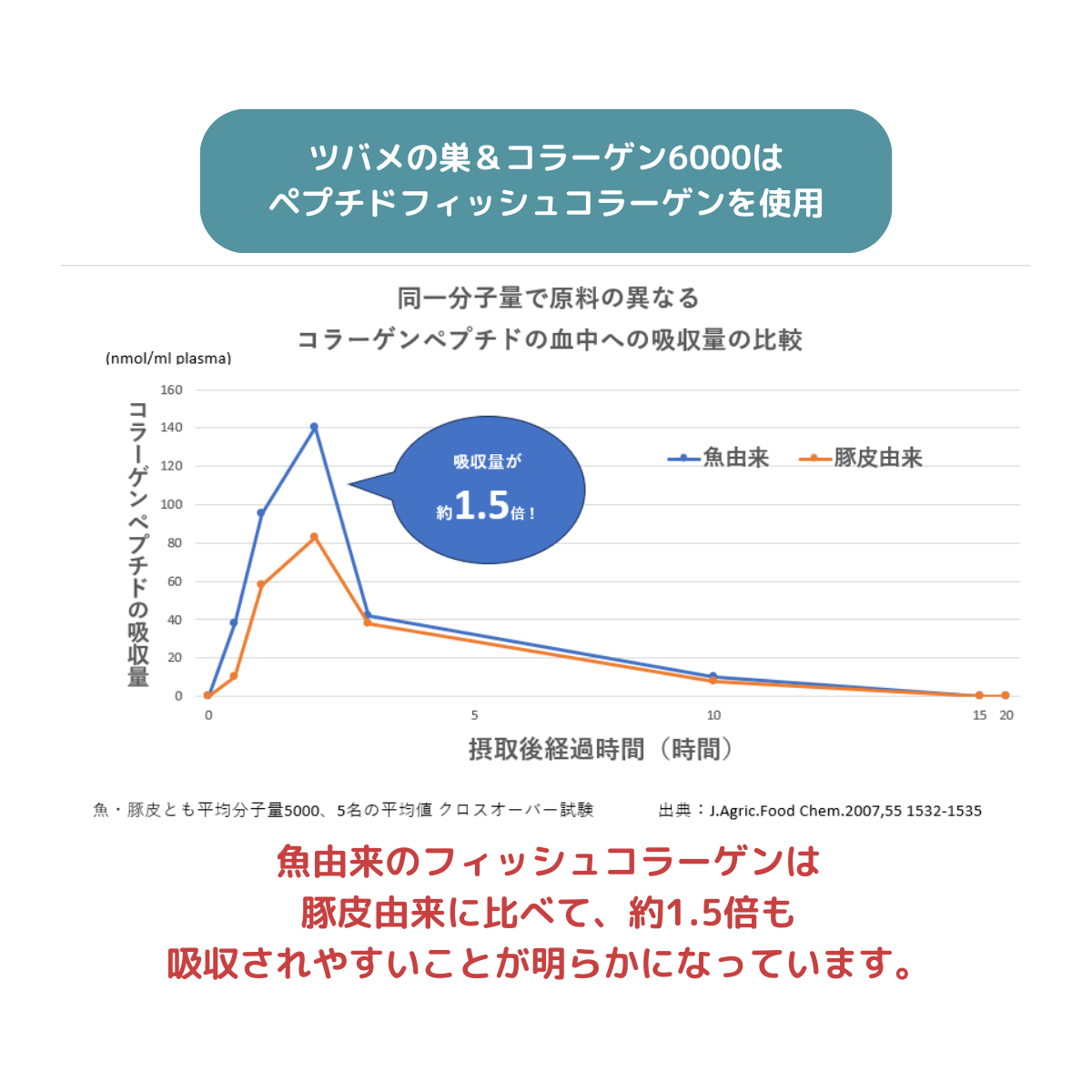 さらに、「ツバメの巣&コラーゲン 6000」に使用しているフィッシュコラーゲンは分子を小さくぺプチド化して吸収を高めています。