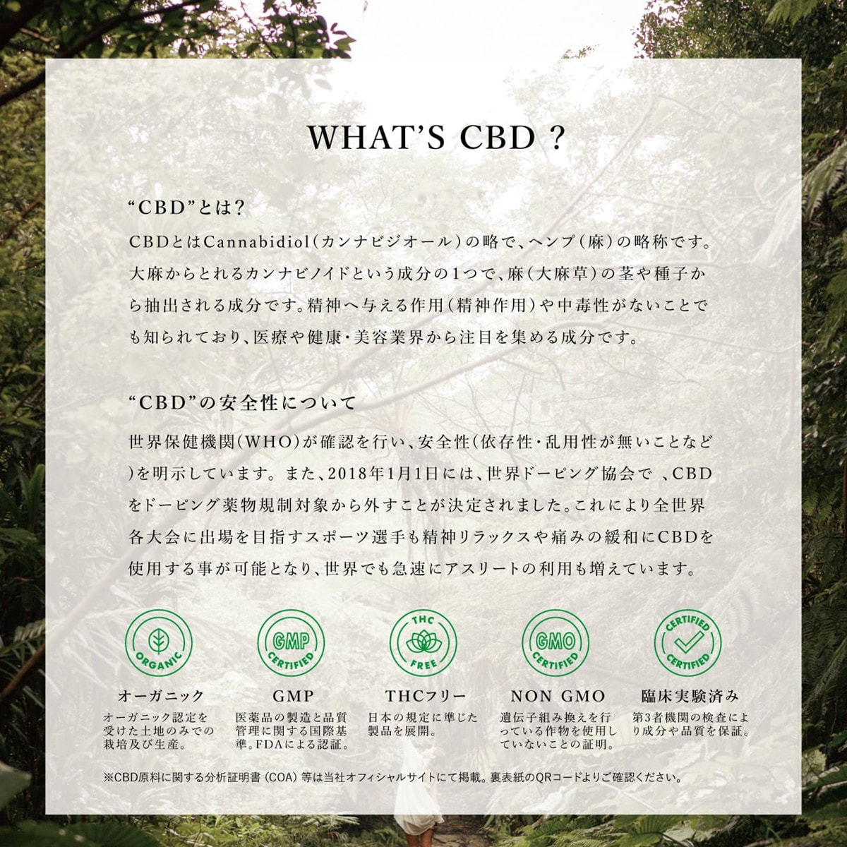 シクロペンタシロキサン、水、グリセリン、エタノール、ジメチコン、カンナビジオール、テトラへキシルデカン酸アスコルビル、トコフェロール、パンテノール、シアノコバラミン、シア脂、アルガニアスピノサ核油、マカデミア種子油、イソステアロイル加水分解コラーゲン、メドウフォーム-δ-ラクトン、アセチルグルコサミン、アセチルヒアルロン酸Na、加水分解ヒアルロン酸、アスパラギン酸Na、アラニン、アルギニン、イソロイシン、グリシン、グルタミン酸、セリン、チロシン、トレオニン、バリン、ヒスチジンHCl、フェニルアラニン、プロリン、リシンHCl、ロイシン、タウリン、アラントイン、グアイアズレン、グリチルリチン酸2K、イソステアリン酸、イソステアリン酸イソプロピル、ポリヒドロキシステアリン酸エチルヘキシル、PCA-Na、ジエチルアミノヒドロキシベンゾイル安息香酸ヘキシル、t-ブチルメトキシジベンゾイルメタン、メトキシケイヒ酸エチルヘキシル、クエン酸、クエン酸Na,イノシン酸2Na、グアニル酸2Na、香料
