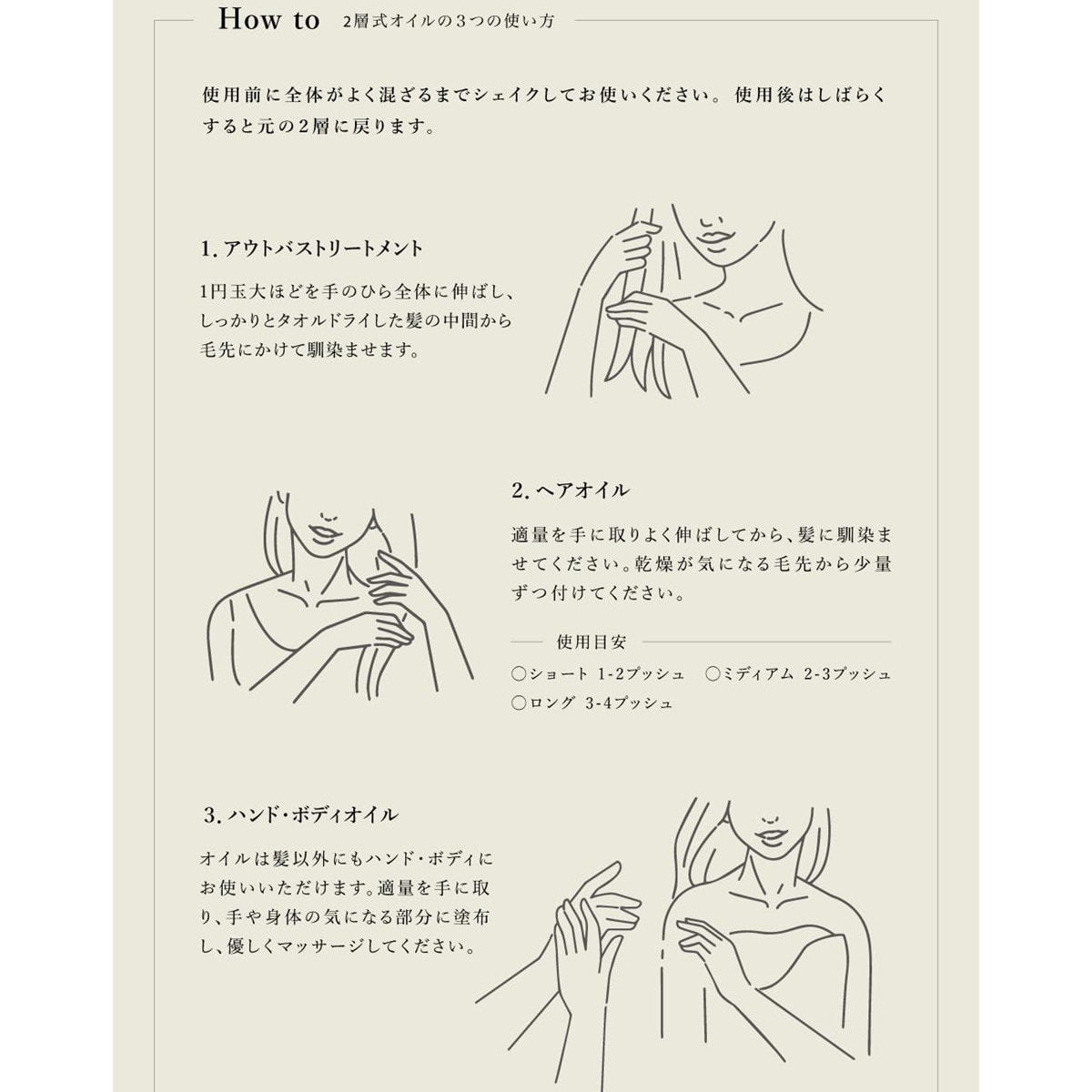適量を手にとり、髪や肌にムラなくのばしてください。