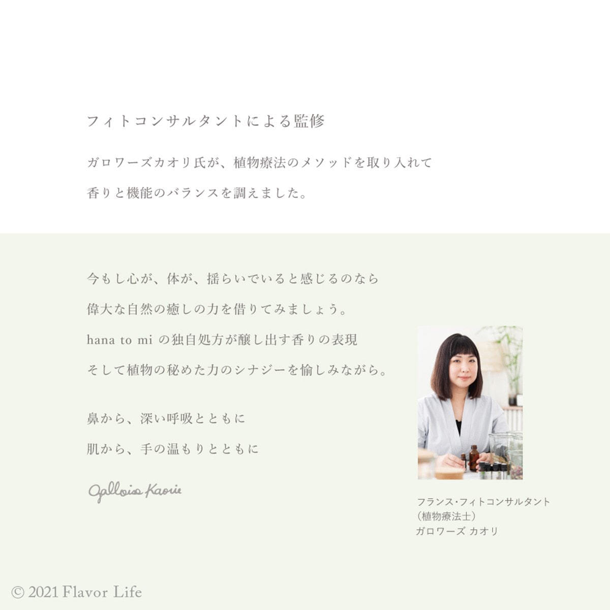 植物の力と香りをカジュアルに、そして効果的に取り入れるため、フランスパリを拠点に活動するフィトコンサルタントが香りを調えました。
