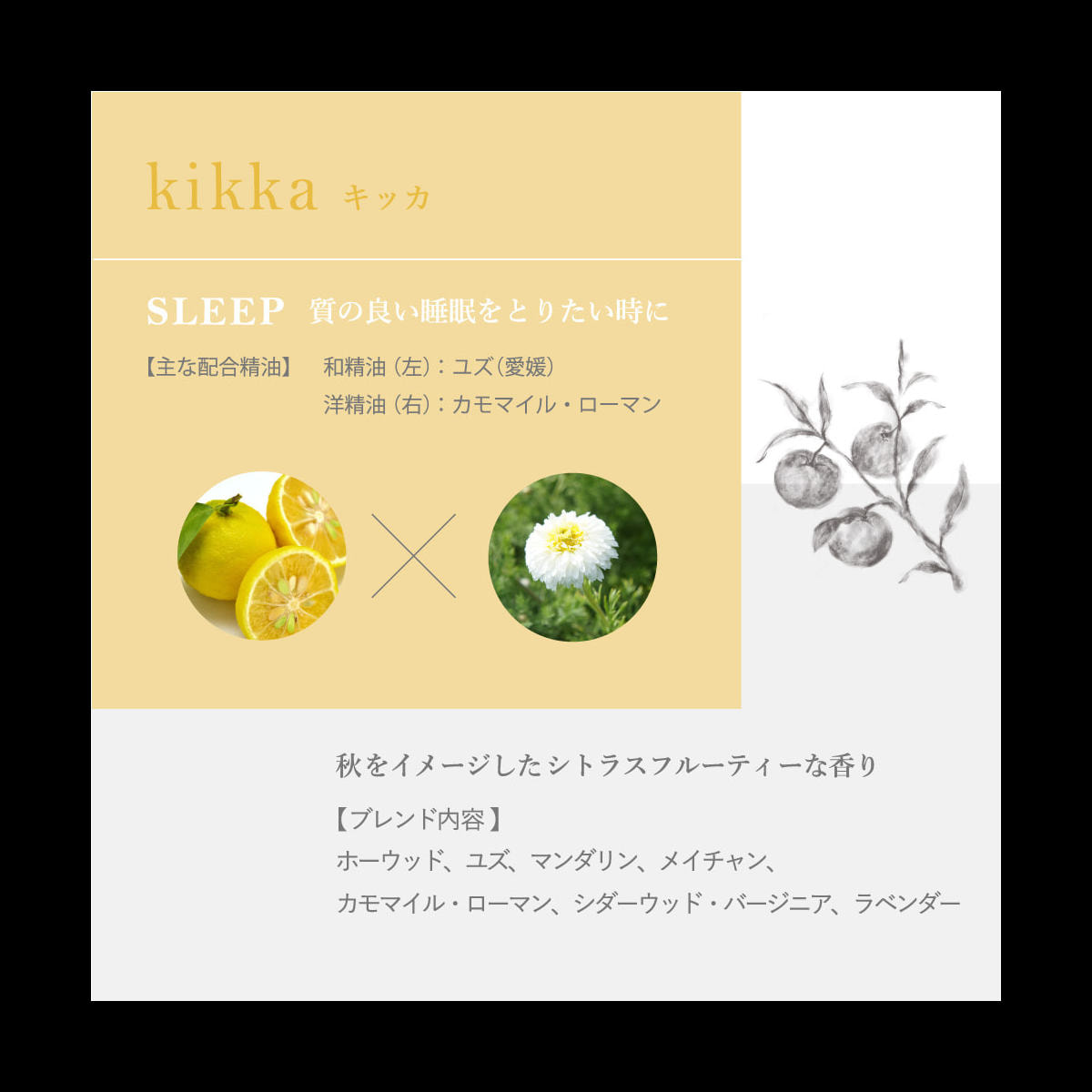 ホーウッド、ユズ、マンダリン、メイチャン、カモマイル・ローマン、シダーウッド・バージニア、ラベンダー
