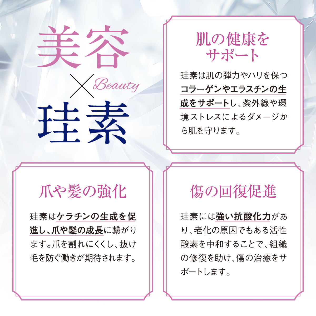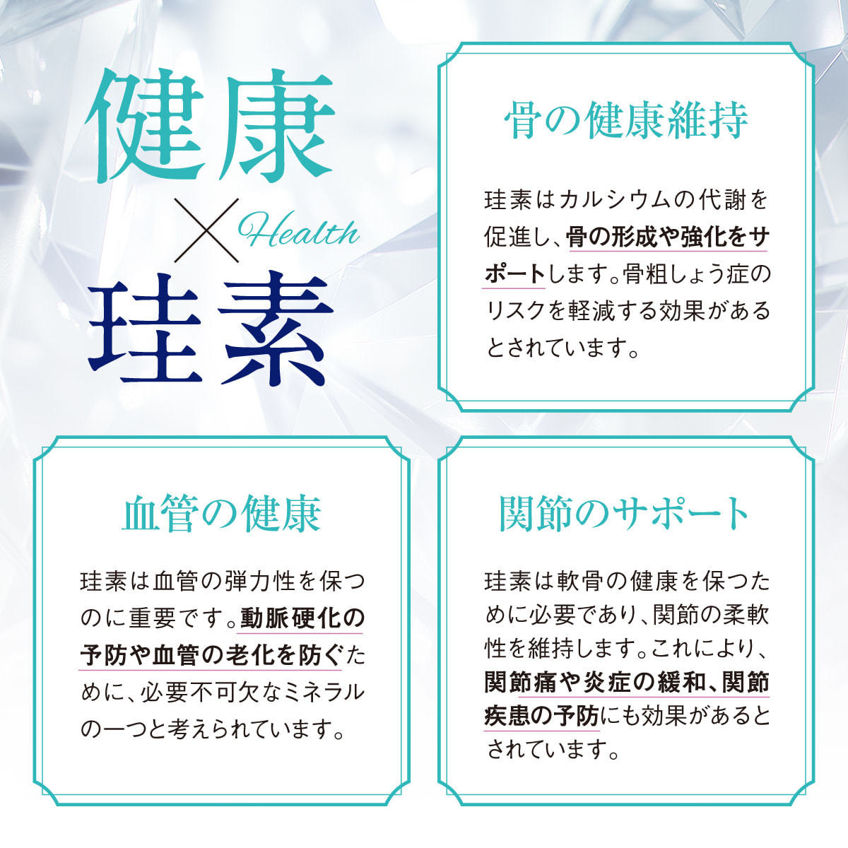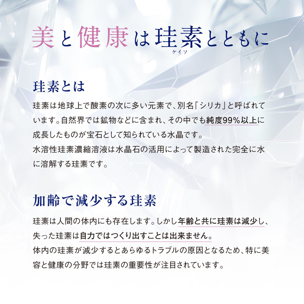 原料元で実証された安全性の高い珪素は学会でも多くのエビデンスがあり、医療先進国では実際の医療現場で活用される貴重な元素を美容や健康管理にお役立てください。