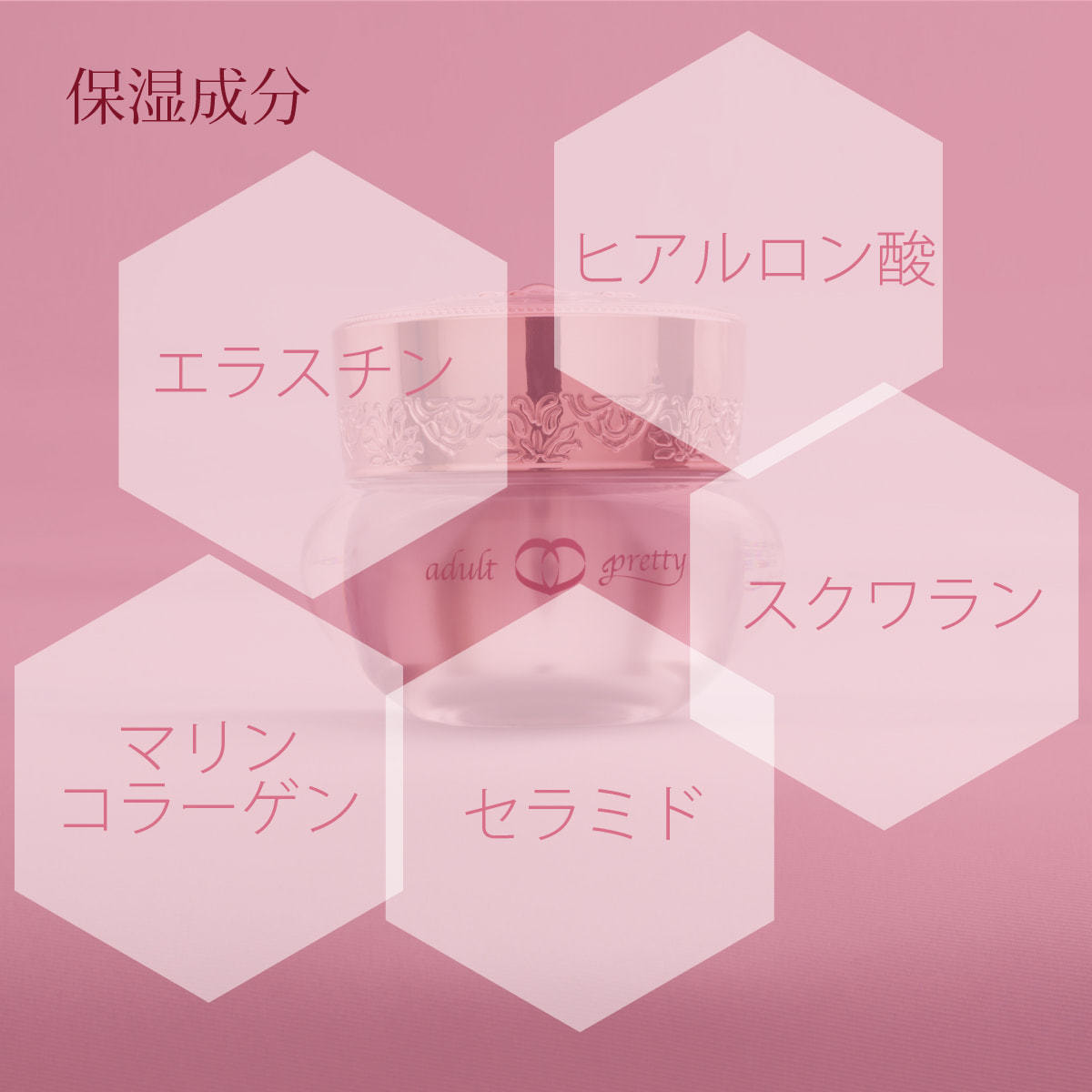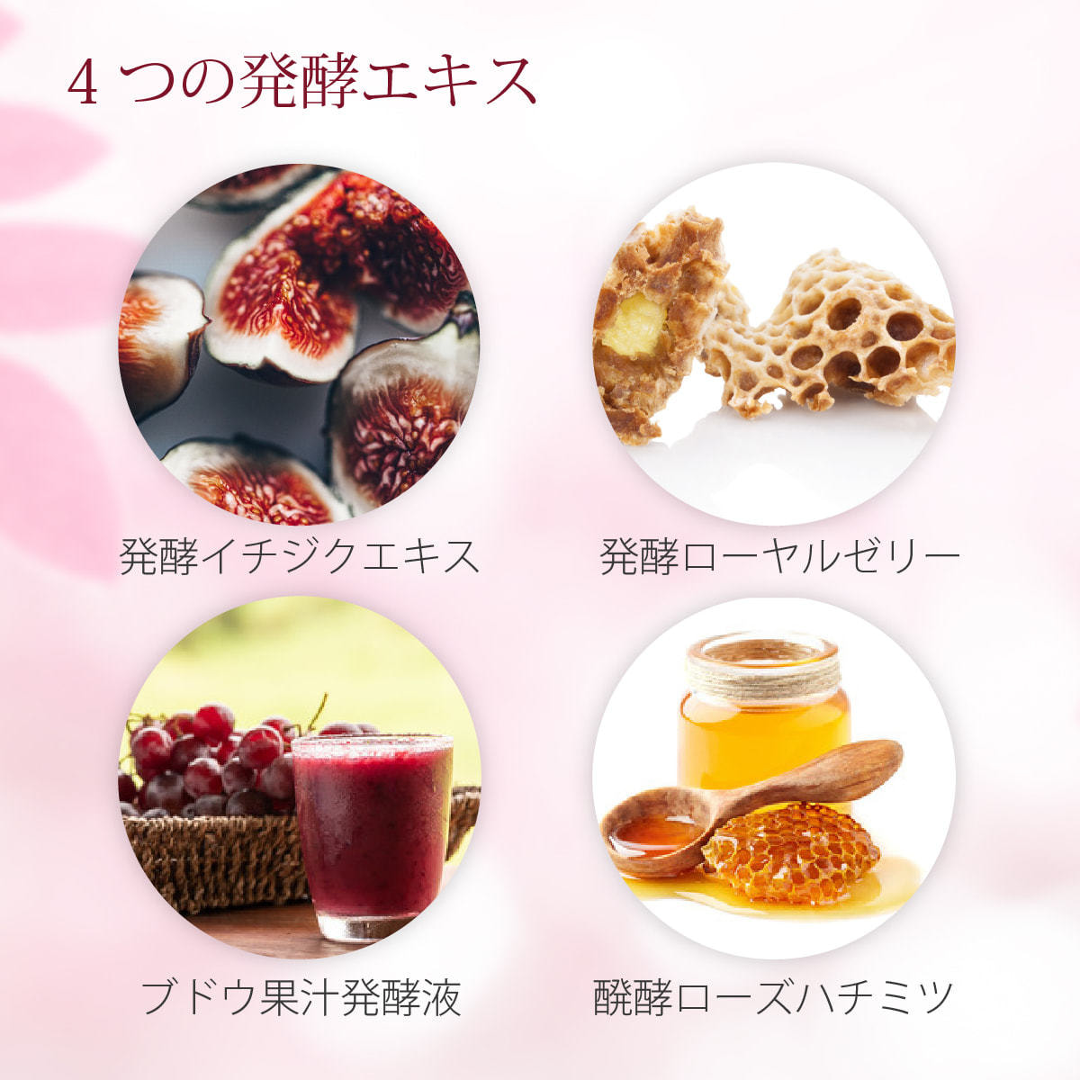 スクワラン、イチジク果実発酵液、乳酸桿菌、ハチミツ発酵液、ローヤルゼリー発酵液、コラーゲン、カミツレ花エキス、ヨモギ葉エキス、メリッサ葉エキス、ローズマリー葉エキス、レスベラトロール、ヒアルロン酸