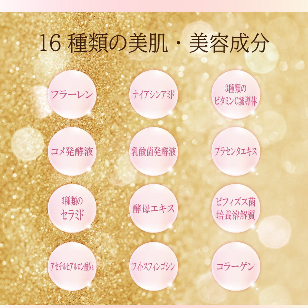 フラーレン、ナイアシンアミド、3種類のビタミンC誘導体、コメ発酵液、乳酸菌発酵液、プラセンタエキス、3種類のセラミド、酵母エキス、ビフィズス菌培養溶解質、アセチルヒアルロン酸Na、フィトスフィンゴシン、コラーゲン