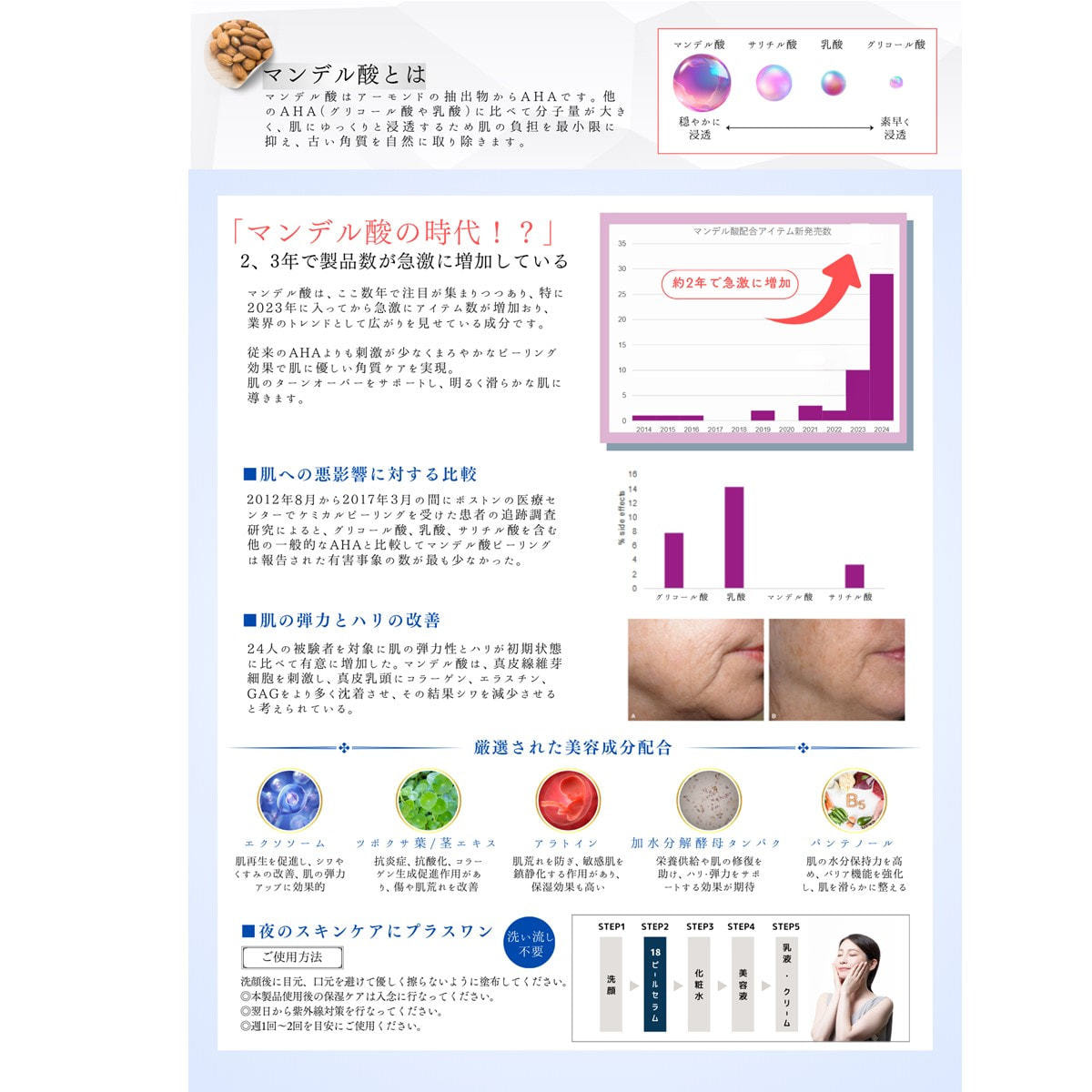 分子量の大きい角質ケア成分「マンデル酸」を18%高配合。