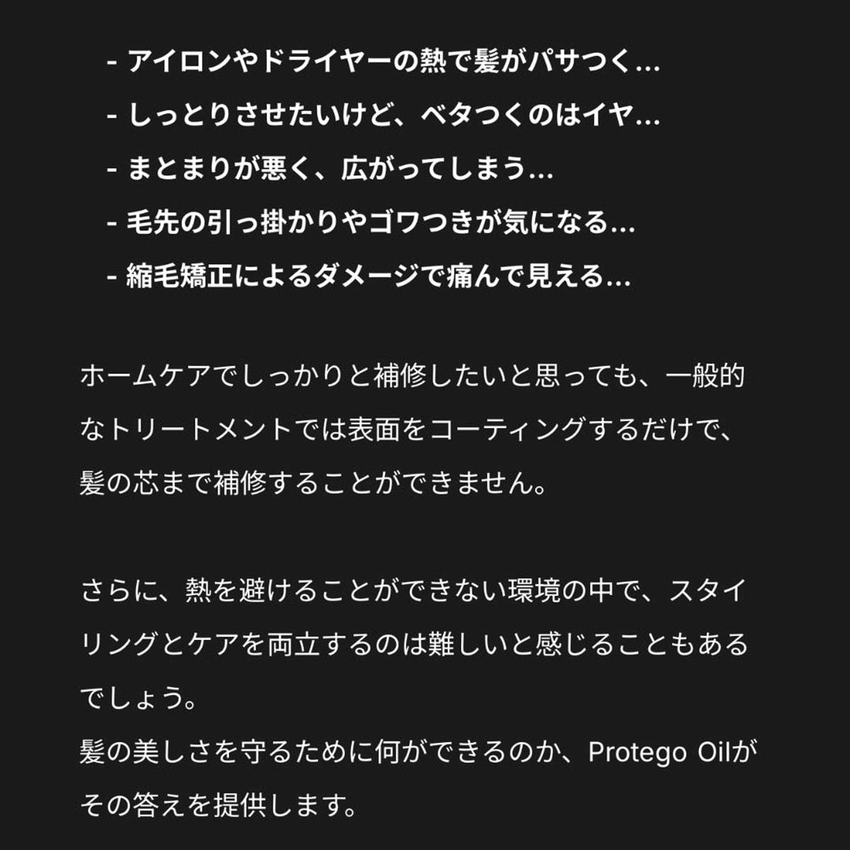 サロン施術後の髪は、美しく健康的な状態に整えられますが、日々のスタイリングや環境の影響で徐々にその美しさが失われていきます。 プロテゴオイルは、 サロンでのケアを自宅でも維持できるよう、髪を守りながら補修するメカニズムを実現。
