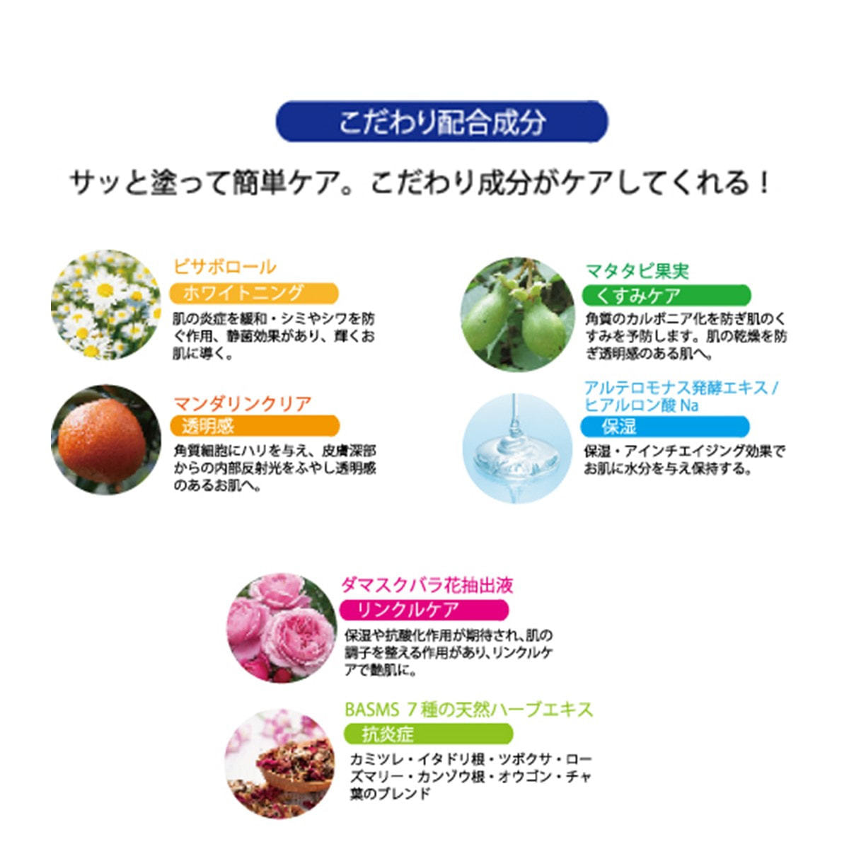 水、マイカ、シクロペンタシロキサン、酸化亜鉛、ジフェニルシロキシフェニルトリメチコン、カプリリルメチコン、イソノナン酸イソトリデシル、 ラウリルPEG−10トリス(トリメチルシロキシ)シリルエチルジメチコン、トリ(カプリル酸/カプリン酸)グリセリルPEG/PPG-19/ 19ジメチコン、酸化チタン、BG、ツボクサエキス、マンダリンオレンジ果皮エキス、オウゴン根エキス、イタドリ根エキス、ビサボロール、 カンゾウ根エキス、チャ葉エキス、アセチルヒアルロン酸Na、ヒアルロン酸Na、加水分解ヒアルロン酸、ローズマリー葉エキス、カミツレ花 エキス、マタタビ果実エキス、ダマスクバラ花エキス、アルテロモナス発酵エキス、イソステアリン酸、セテス-10、ジメチコン、ミリストイルメチル−β−アラニン(フィトステリル/デシルテトラデシル)、硫酸Mg、水酸化Al、ステアリン酸、ステアリン酸イヌリン、グリチルレチン酸ステアリル、トコフェロール、ペンチレングリコール、フェノキシエタノール、ハイドロゲンジメチコン、青1、赤226