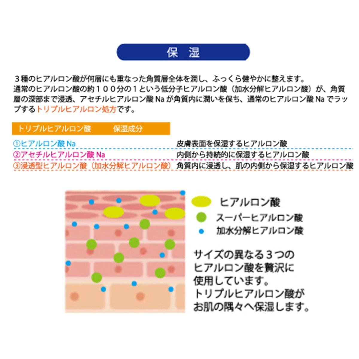 通常のヒアルロン酸の約100分の1という体分子ヒアルロン酸(加水分解ヒアルロン酸)が角質層の深部まで浸透、アセチルヒアルロン酸Naが潤いを保ち、通常のヒアルロン酸で皮膚表面を保湿する、トリプルヒアルロン酸処方です。