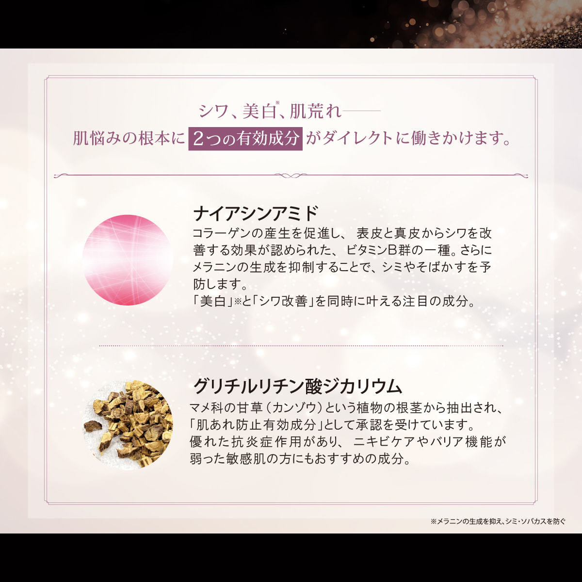 有効成分が表皮・真皮まで深く効果を発揮し、シワやシミの原因にダイレクトに働きかけ、予防はもちろん “できてしまったシワやシミ”も改善します。
