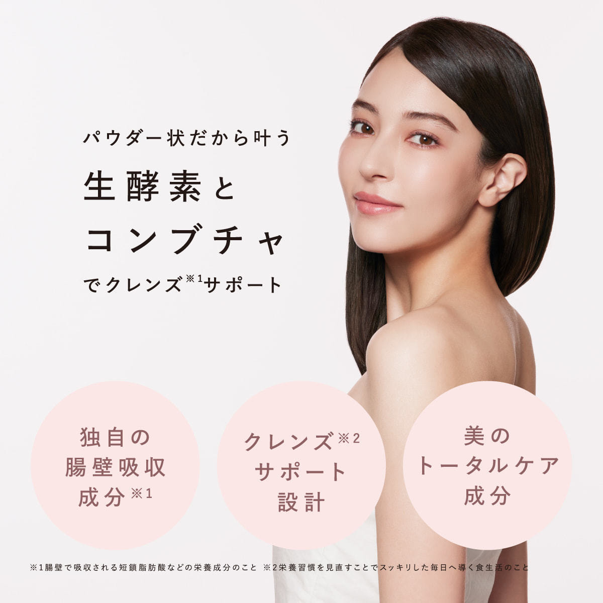 難消化性デキストリン(アメリカ製造)、イヌリン、フィッシュコラーゲン、フラクトオリゴ糖、植物発酵エキス(デキストリン、甜菜糖、黒砂糖、麦芽糖、ヨモギ、ウコン、ドクダミ、ハスの葉、高麗人参、センシンレン、オトギリソウ、クマザサ、タンポポの根、霊芝、アマチャヅル、トチュウ葉、オオバコ、カンゾウ、マツ葉、ナンテンの葉、アマドコロ、ツユ草、ツルナ、マカ、トンカットアリ、ハブソウ、ハト麦、スギナ、ビワ葉、ラカンカ、クコの実、レンセンソウ、モモの葉、イチョウ葉、ニンドウ、イチジクの葉、ベニバナ、エゾウコギ、エンメイソウ、モロヘイヤ、セッコツボク、アカメガシワ、クコ葉、カキの葉、カミツレ、カリン、シソ葉、桑葉、メグスリの木、田七人参、キキョウ根、ナツメ、サラシア、マタタビ、エビス草の種子、紅参、アガリクス、ルイボス、アムラの実、タマネギ外皮、キャッツクロー、ウメ、キンカン、イチジクの実、ミカン、パインアップル、リンゴ、グレープ、メロン、レモン、グレープフルーツ、アンズ、トウガラシ、ショウガ、シイタケ、ニンジン、タマネギ、パセリ、キャベツ、ゴボウ、モヤシ、ニンニク、コンブ、フノリ、大豆、コリアンダー、ピーマン、山芋、ホウレン草、いんげん豆、ゆりの根、黒小豆、アスパラガス、にら、せり、れんこん、きくらげ、マンゴー、レイシ、パパイヤ、梨、バナナ、ビワ、グァバ、スターフルーツ、レンブ、パッションフルーツ、リュウガン、スイカズラ、ハイビスカス、コウゾリナ、やまたばこ、抹茶)、発酵紅茶エキス末、穀物発酵エキス、亜鉛含有酵母、乳酸菌末、BG・21菌発酵物、酪酸菌末、ビタミンE含有植物油、米胚芽抽出物、エラスチン(魚由来)、ライチ果汁末/クエン酸、ヒアルロン酸、L-グルタミン、V.C、甘味料(ステビア)、香料、ヘスペリジン、シクロデキストリン、ナイアシン、パントテン酸Ca、加工デンプン、V.B₂、V.B₁、V.B₆、V.A、結晶セルロース、葉酸、V.D、V.B₁₂、(一部に小麦・乳成分・大豆・ゼラチン・バナナ・やまいも・りんごを含む)